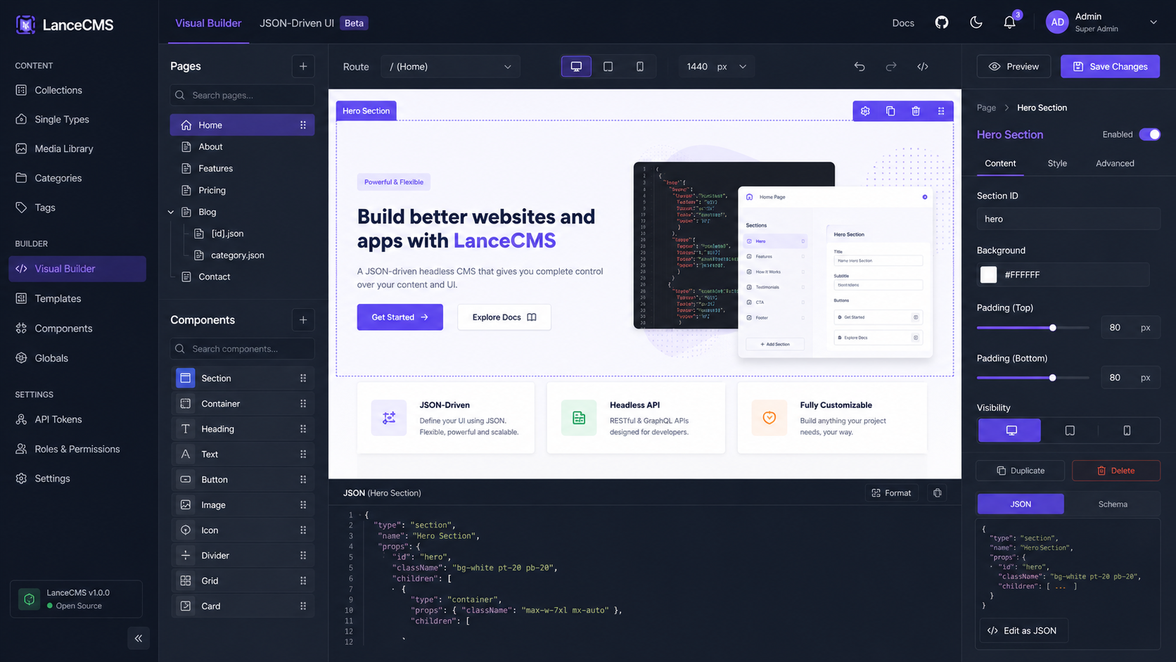 LanceCMS is a developer-first platform to define backend, generate APIs, build UI using JSON, and automate workflows — powering both web and Flutter apps.
