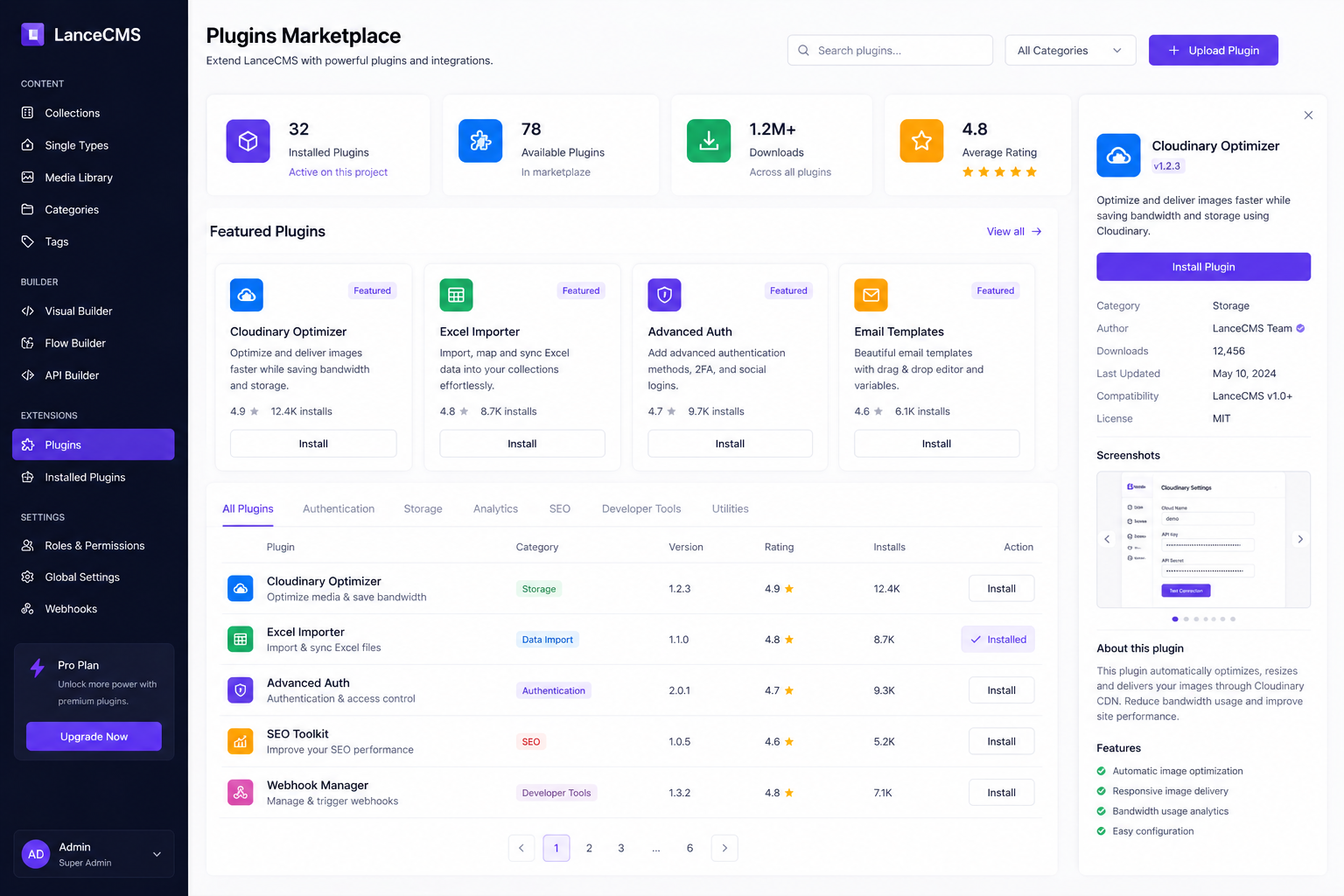 Add features like media optimization, Excel import, authentication and more via plugins.